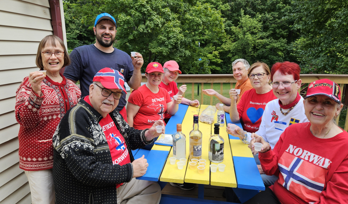Nordkap’s Steam & Corn Roast volunteers celebrate a successful fundraiser for the Swedish Club in September 2025 with a aquavit tasting on the deck of the Swedish Club in Farmington Hills Michigan. Skål!