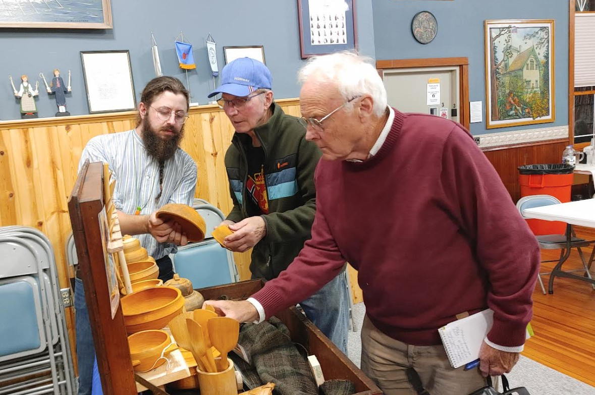 andt Lodge hosted a program on “Early Bowl Turning in Noway” by Derek Brabender of Green Wood Spoons. Derek is an artisan green woodworker based in Stoughton, WI, who specializes in creating beautiful and functional everyday items with hand tools and on a foot-powered pole lathe. In 2024 Derek was awarded an Artist Fellowship from the American Scandinavian Program to study advanced pole lathe turning techniques with Jarrod Dahl in Ashland, WI, as well as visit the Vesterheim Norwegian-American Museum to study bowls in their collection and learn more about early bowl turning practices in Norway. Here he is showing Mandt Lodge member John Arneson some of his projects.
