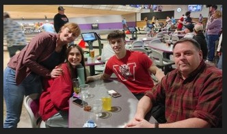 Mandt Lodge 5-314 members enjoy an afternoon of bowling, pizza, and prizes as the lodge partners with First Lutheran Church on this activity. Here Natasha, Anna, and Don Amundson enjoy the afternoon with prospective member Trygve!