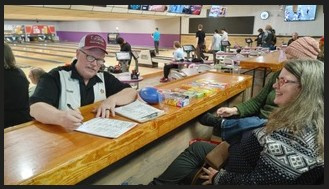 Mandt Lodge 5-314 partners with First Lutheran Church for a bowling event. This is a great community outreach and members of both groups get to mingle and socialize. Mandt Sports Director Todd Fossum totals up scores as Pastor Sara Ehrets enjoys watching the bowlers.