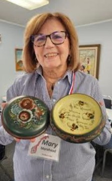 For its February members gathering at the Swedish Club in Farmington Hills Michigan, Nordkap asked members to show-and-tell about a favorite Rosemaling object. Secretary Mary Morehead displayed a lidded bowl with a fetching message, “As the flowers bloom, I shall love thee forever.”