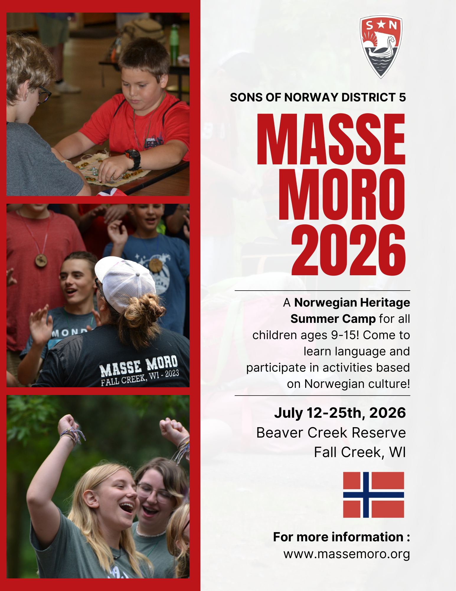 Masse Moro provides an excellent learning opportunity for our youth ages 9 to 15 years of age. Our summer camp strives to fulfill the mission of Sons of Norway by preserving and promoting our Norwegian heritage in a number of different ways during the two weeks session. From learning how to bake delicious Norwegian desserts, playing kubb on the sports field, gazing up at the stars, and singing songs in Norwegian there is a wide variety of activities each day at camp. Campers do not have to be Sons of Norway members to attend camp, but we encourage them to become members. Any Sons of Norway Lodges who would like to learn more about Masse Moro, our Norwegian Heritage camp, are encouraged to contact me to make a presentation to your Lodge.